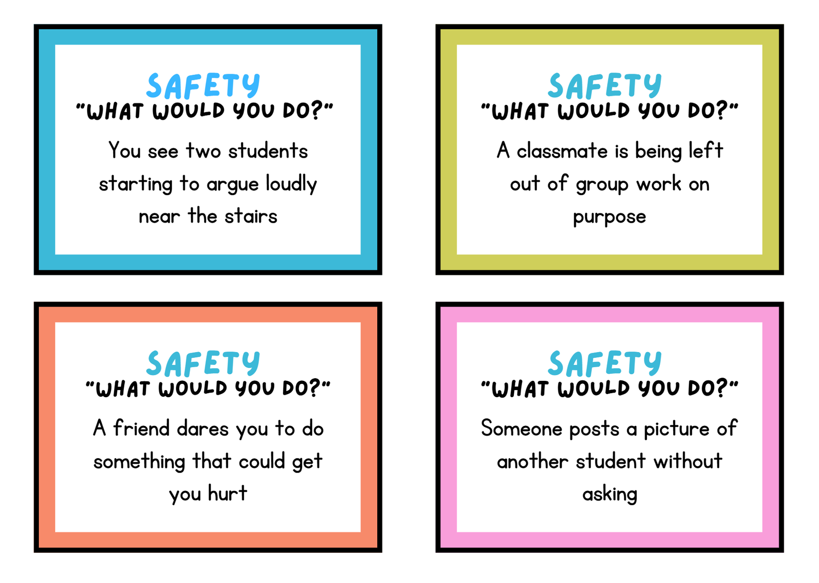 Editable A3 printable safety question cards for kids. This Canva template helps children talk about safety, feelings, choices, and everyday situations in a simple and engaging way. Easy to customize and download for home, classroom, or counseling use.